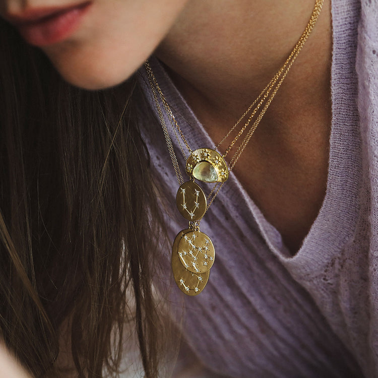 Hand hammered 14k gold Astrology necklaces handmade in Los Angeles with diamond constellations inspired by the cosmos.