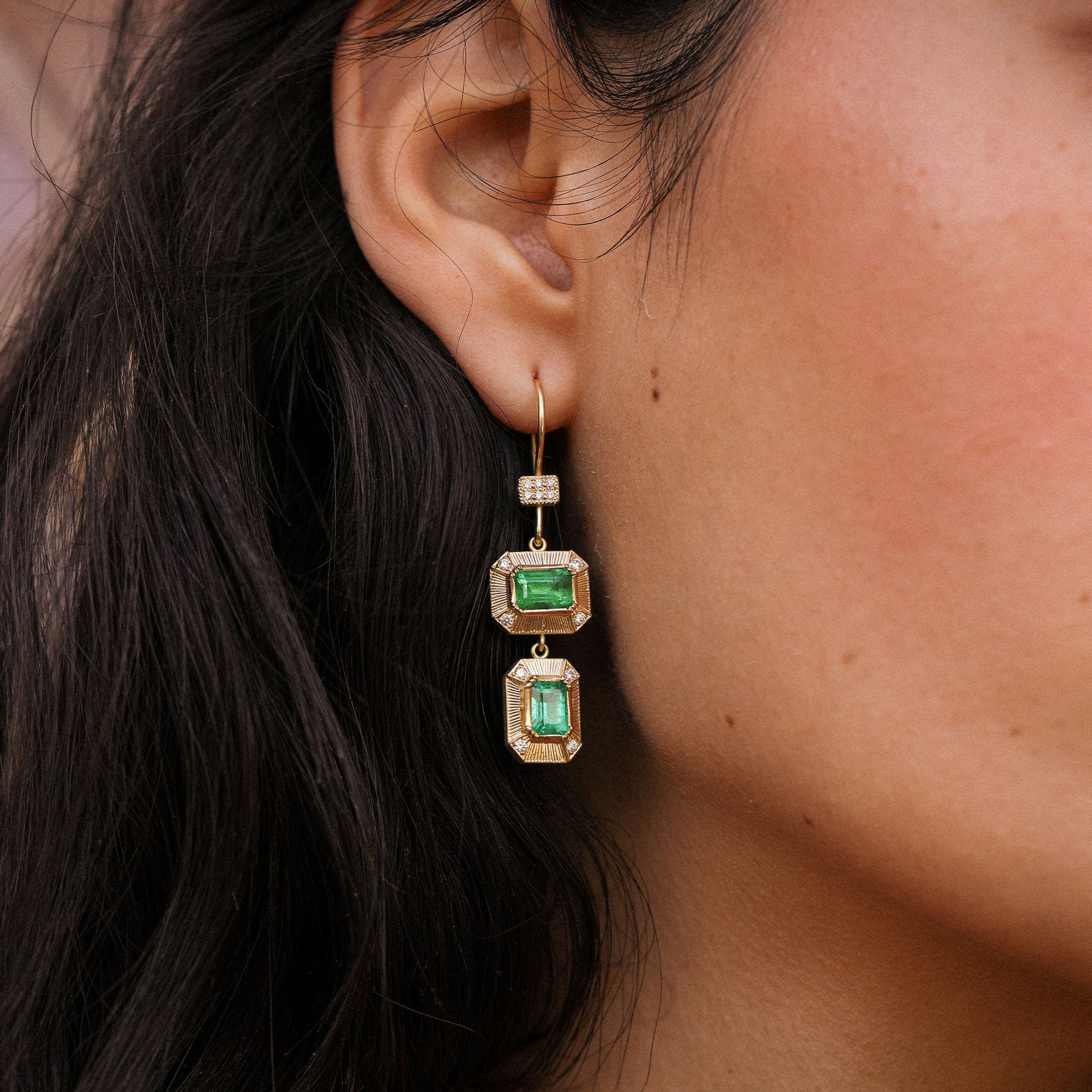 From Brooke's Utopia Collection one of a kind 18k gold Zambian Emerald drop earrings with hand engraving and white Diamond pave sparkle.