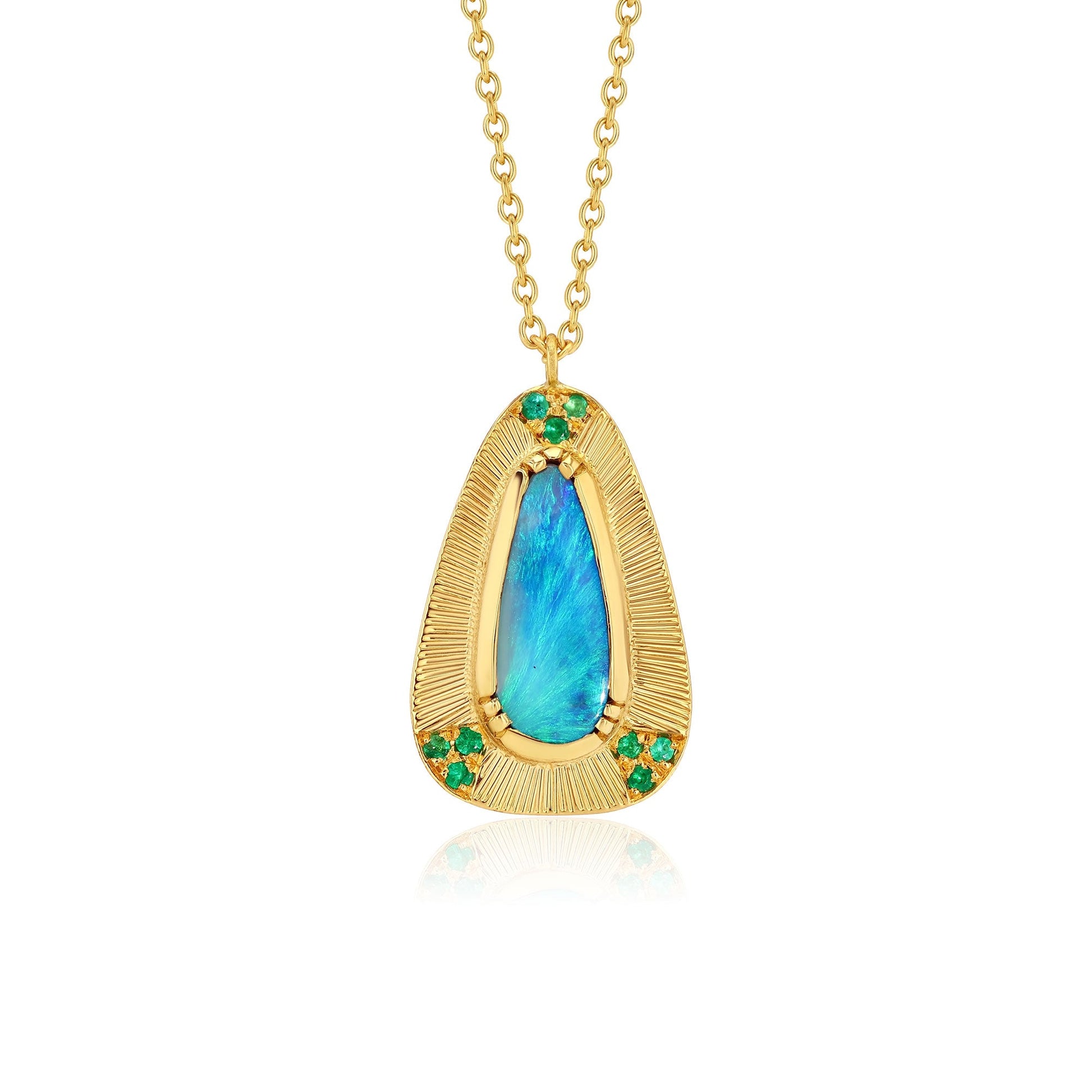 18k gold georgian style bezel boulder opal necklace with hand engraving and emerald pave detail.