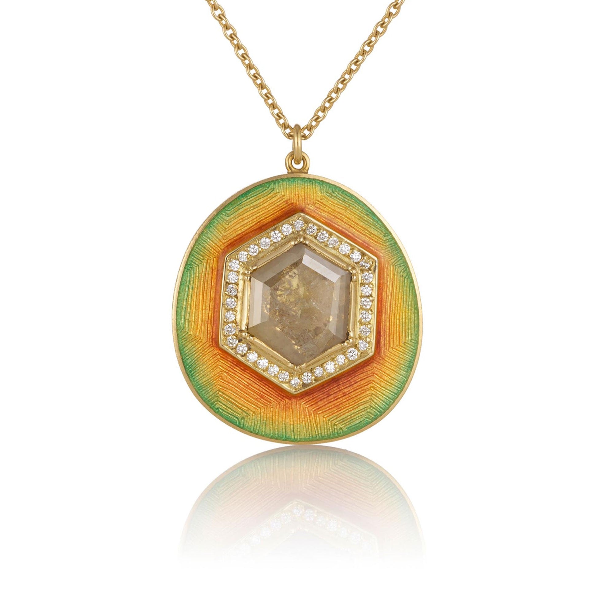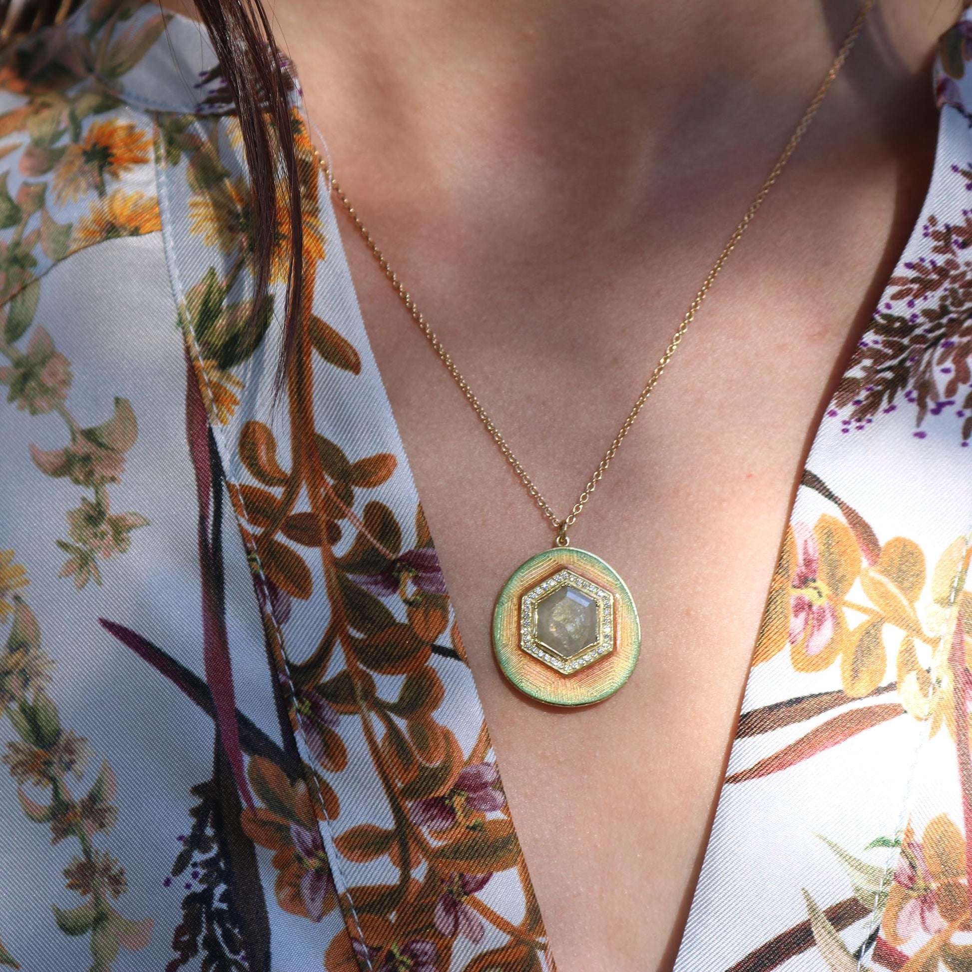 From Brooke's Talisman Collection one of a kind raw Diamond and white Diamond pave necklace enhanced with hand engraving and vibrant enamel.