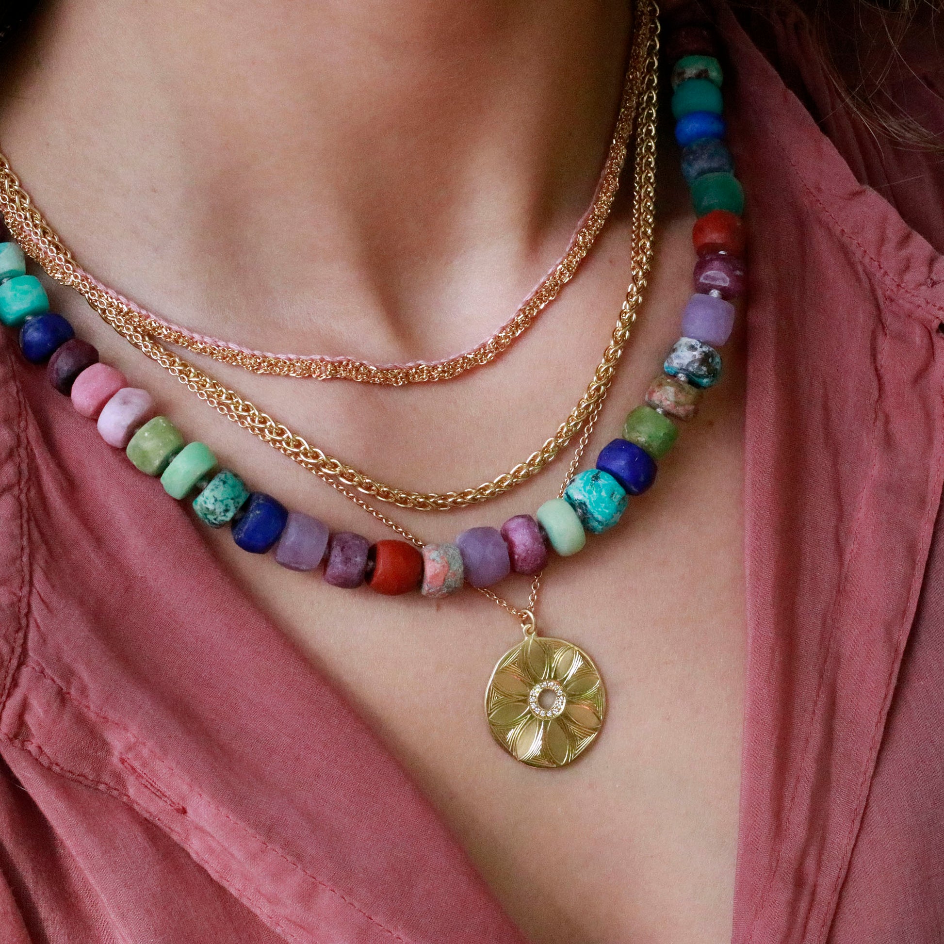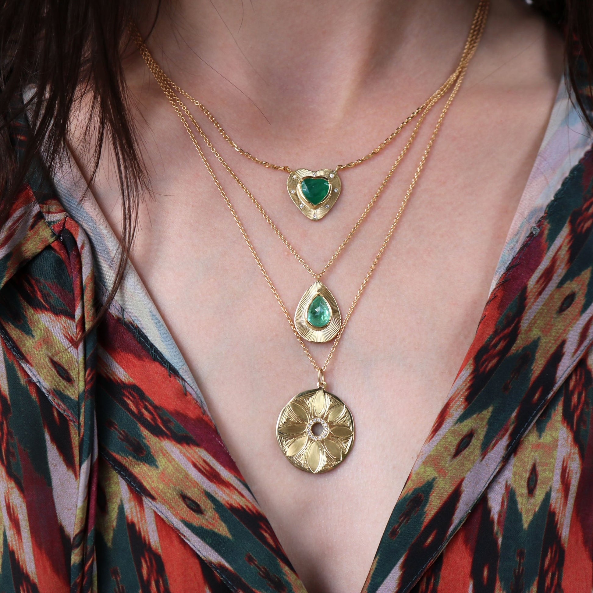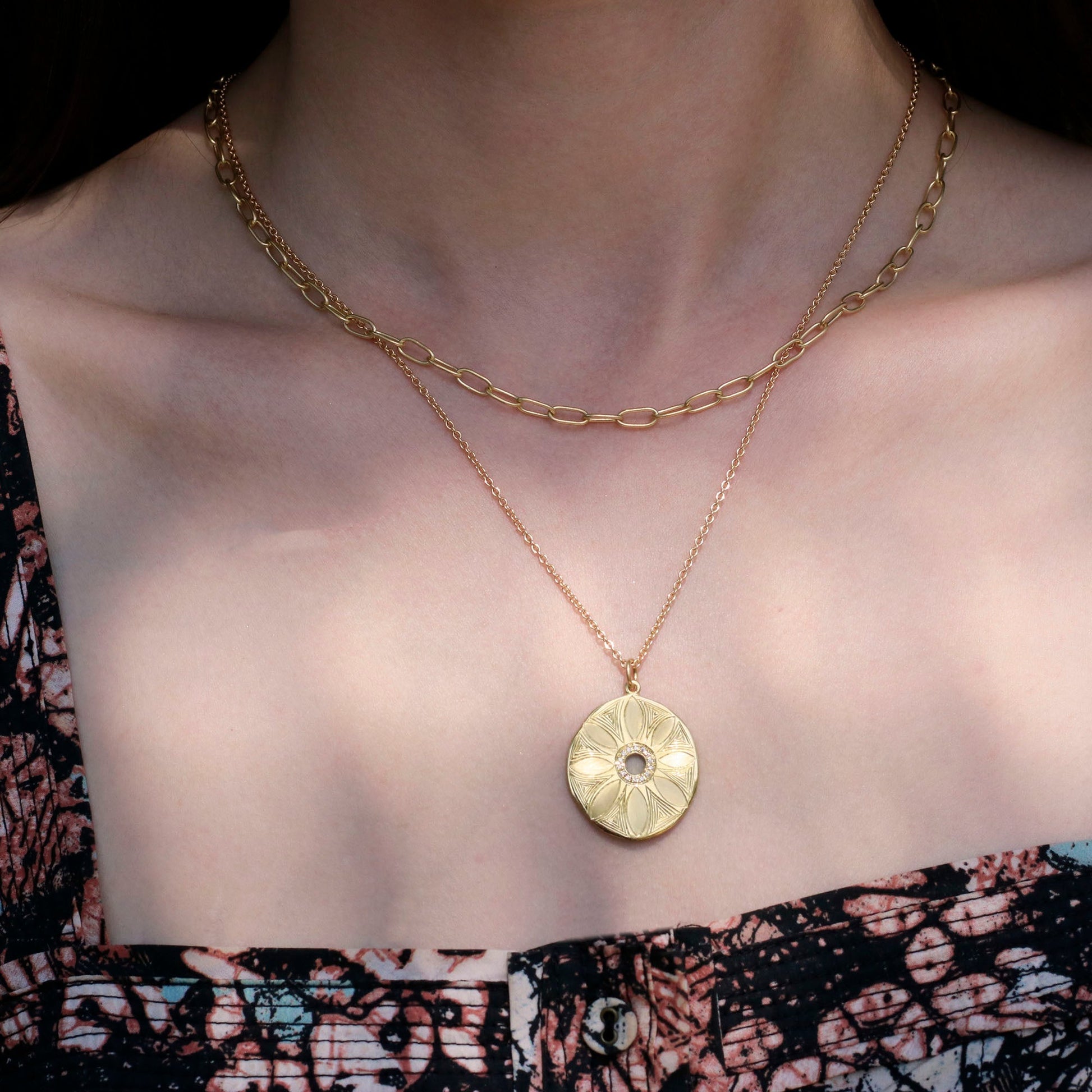 From Brooke's Talisman Collection hand engraved floral pattern necklace with white Diamond pave highlights.