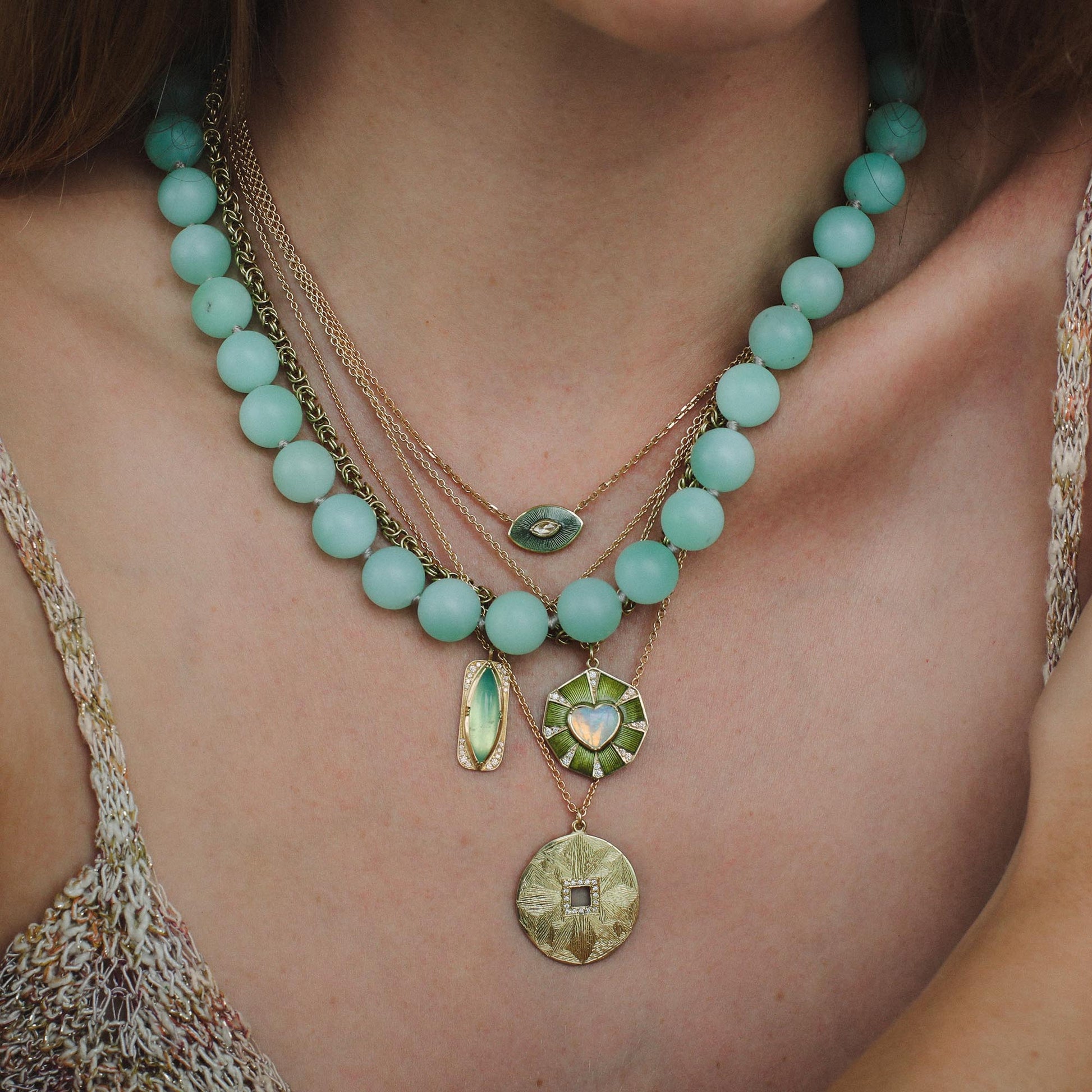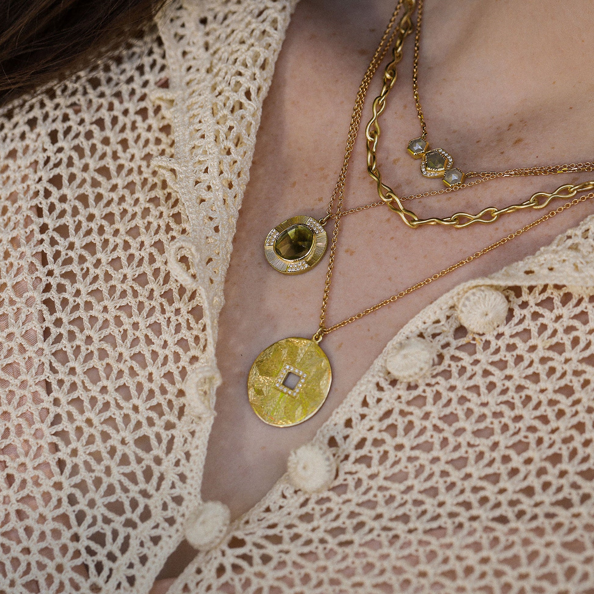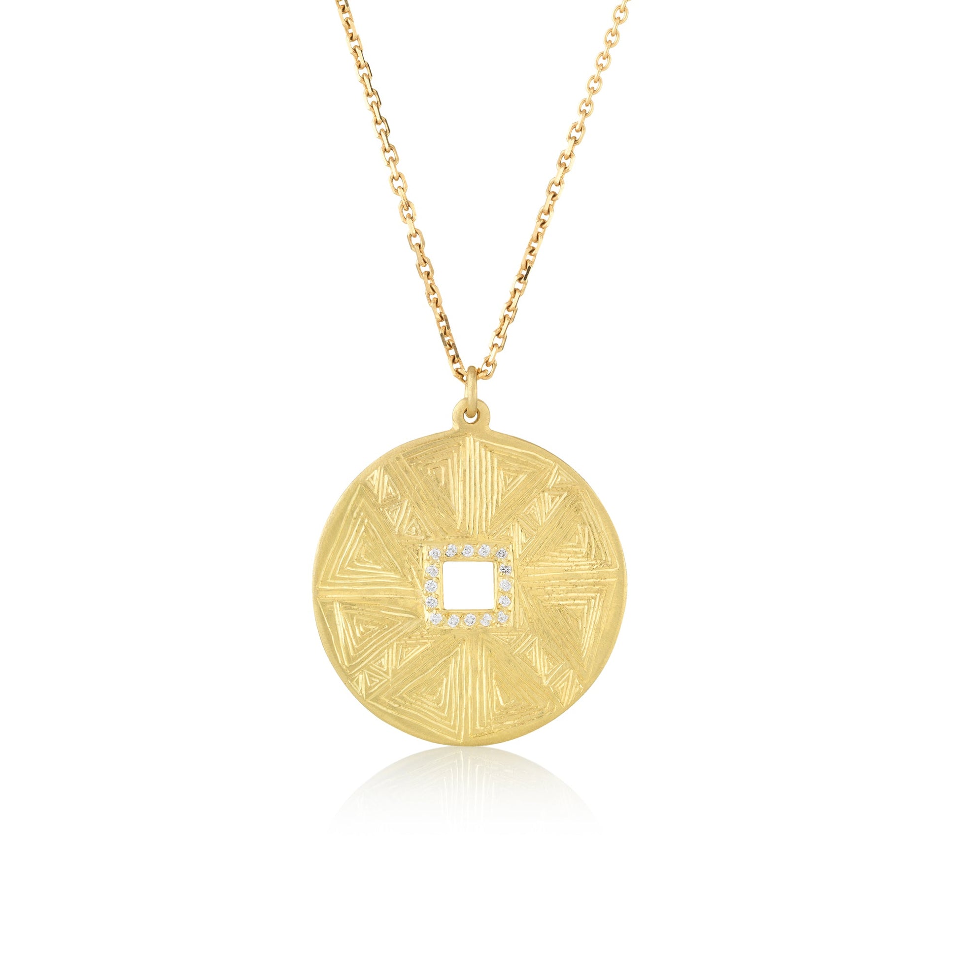 From Brooke's Talisman Collection hand engraved mandala pattern necklace with white Diamond pave highlights.
