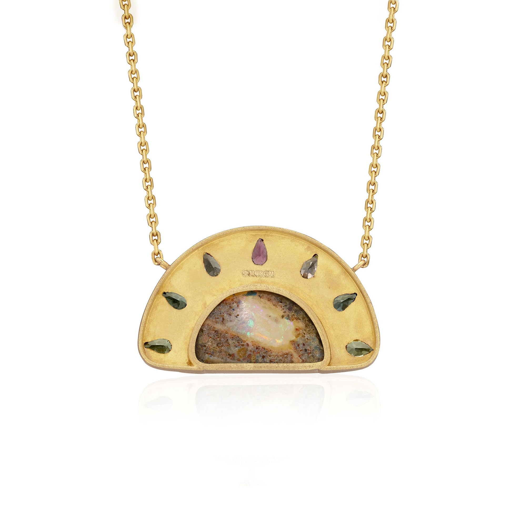 From Brooke's Supernova Collection one of a kind 18k gold necklace with Australian Opal, mixed color Sapphire and white Diamond sparkle.