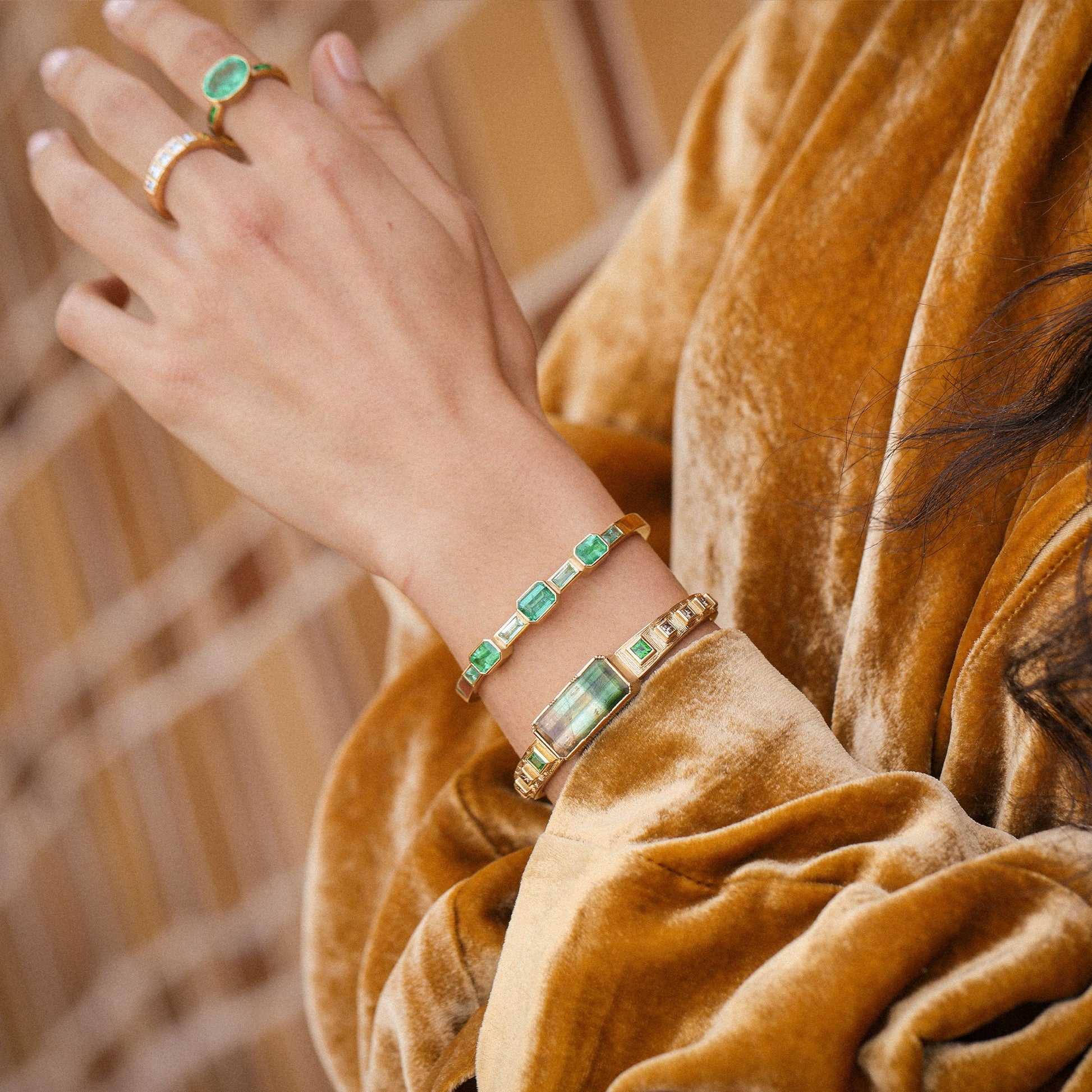 From Brooke's Utopia Collection, this magical one of a kind hand engraved cuff is enhanced with a mesmerising tri-color Tourmaline that takes center stage. Hand-engraved gold provides an artisanal canvas for Indicolite Tourmalines and Cognac Diamonds. A true treasure, it embodies both otherworldly beauty and ethereal wonder.