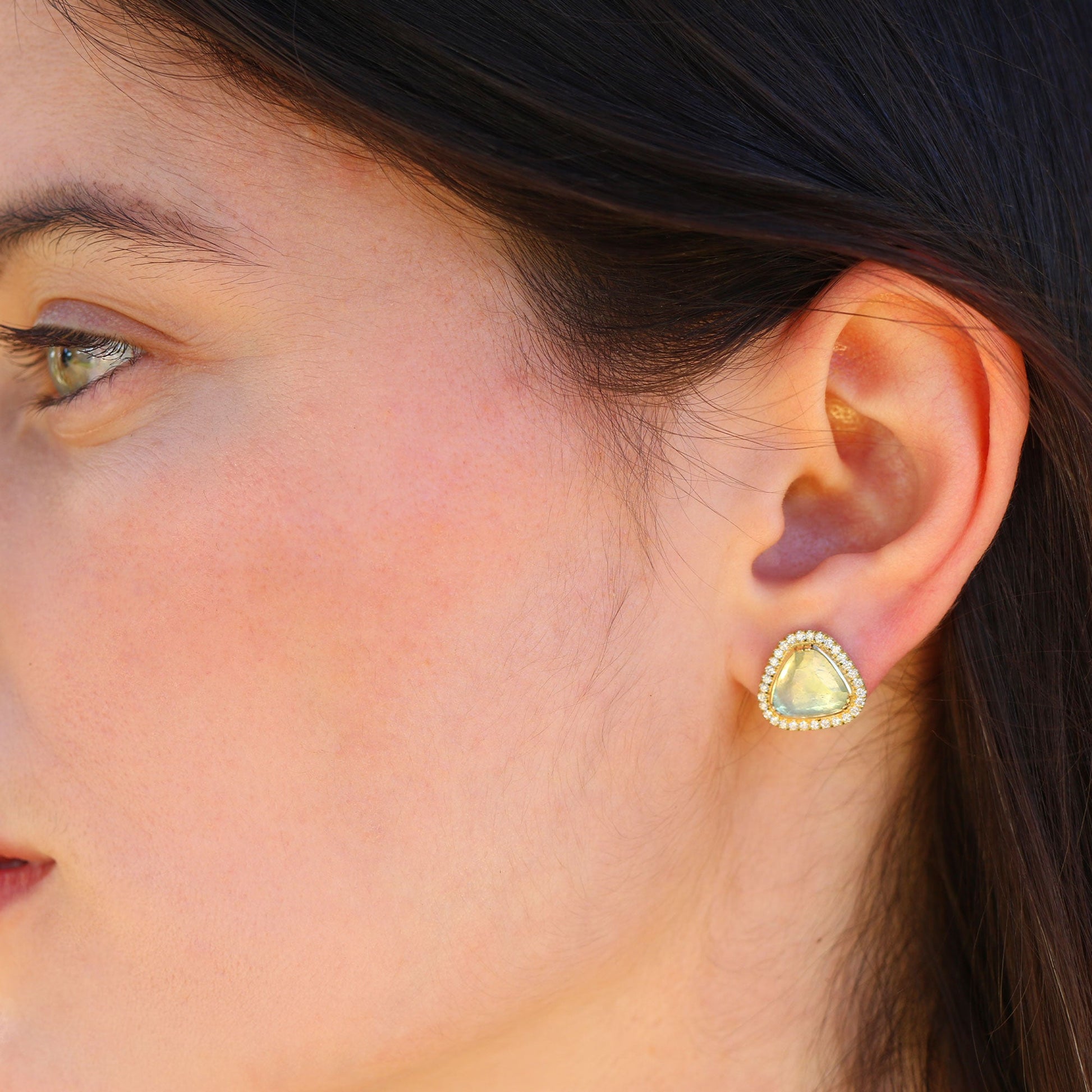 From Brooke's Orbit Collection one of a kind 18k gold Aquamarine stud earrings surrounded by sparkling white Diamond pave.