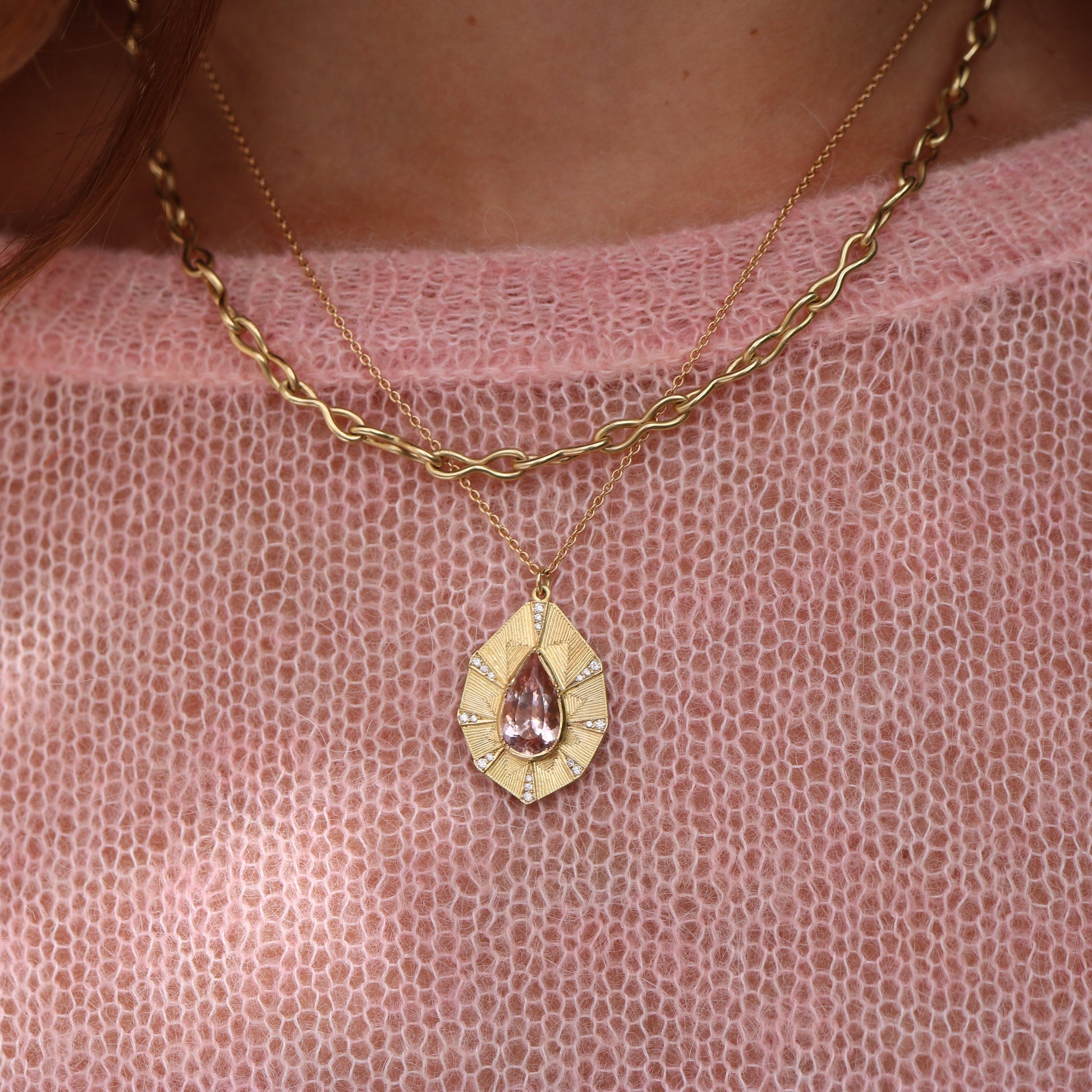From Brooke's Talisman Collection, one of a kind hand engraved Morganite necklace with white Diamond pave highlights.