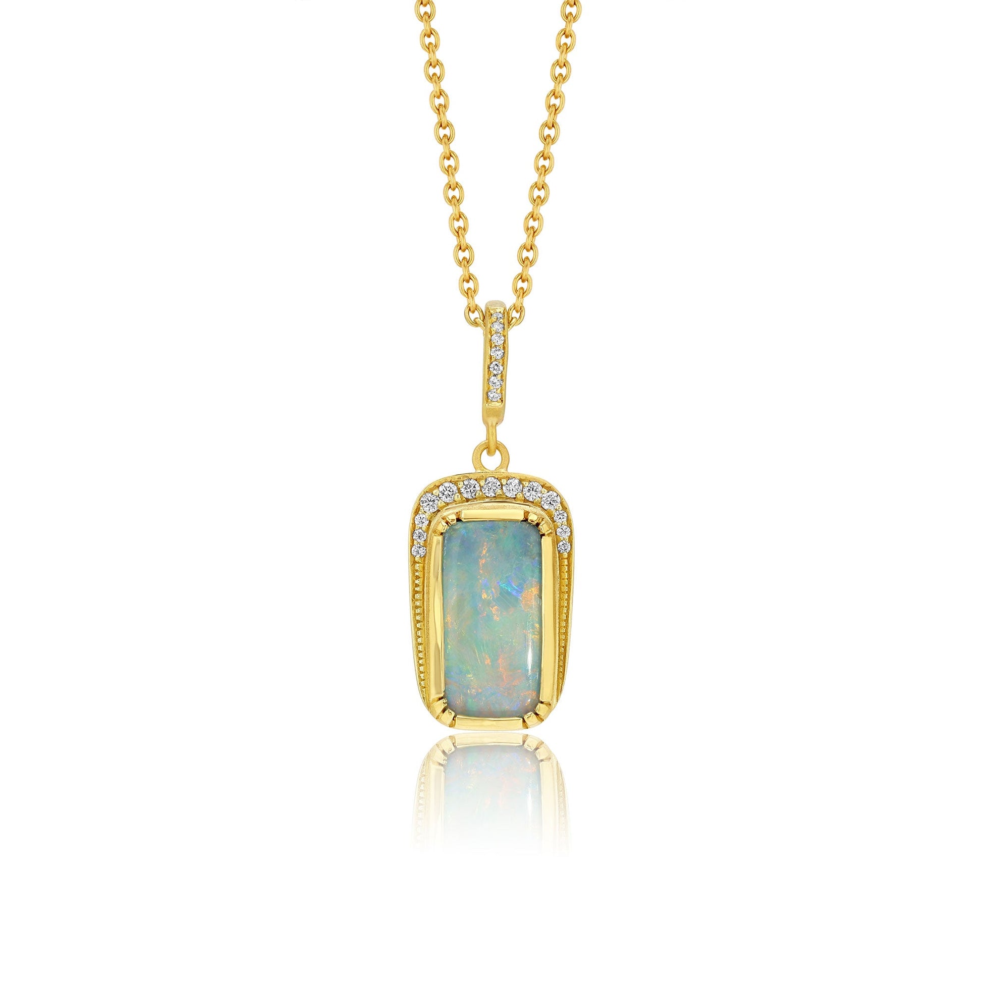 Hand-forged in 18k yellow gold, this one-of-a-kind, Boulder Opal was hand-selected by Brooke for its balance of modern and organic form, along with subtle color variation. The stone is enhanced by a halo of white pave diamonds and a textural setting inspired by Georgian jewelry, signature to the Brooke Gregson aesthetic.