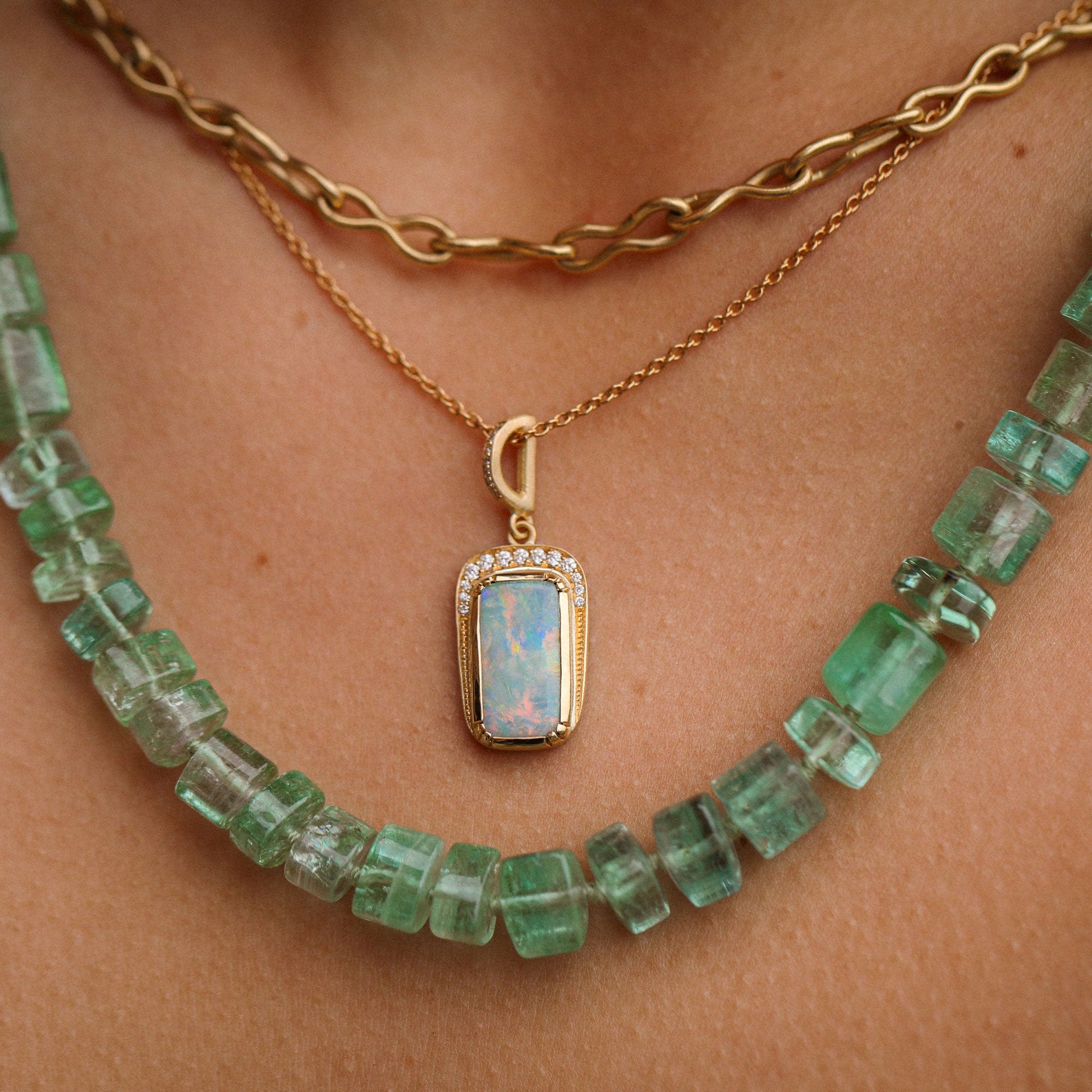 This piece sits well on its own or layered with necklaces. It is versatile because of its adjustable length. Brooke styled this piece with the Mint Tourmaline Beads and Mobius Chain