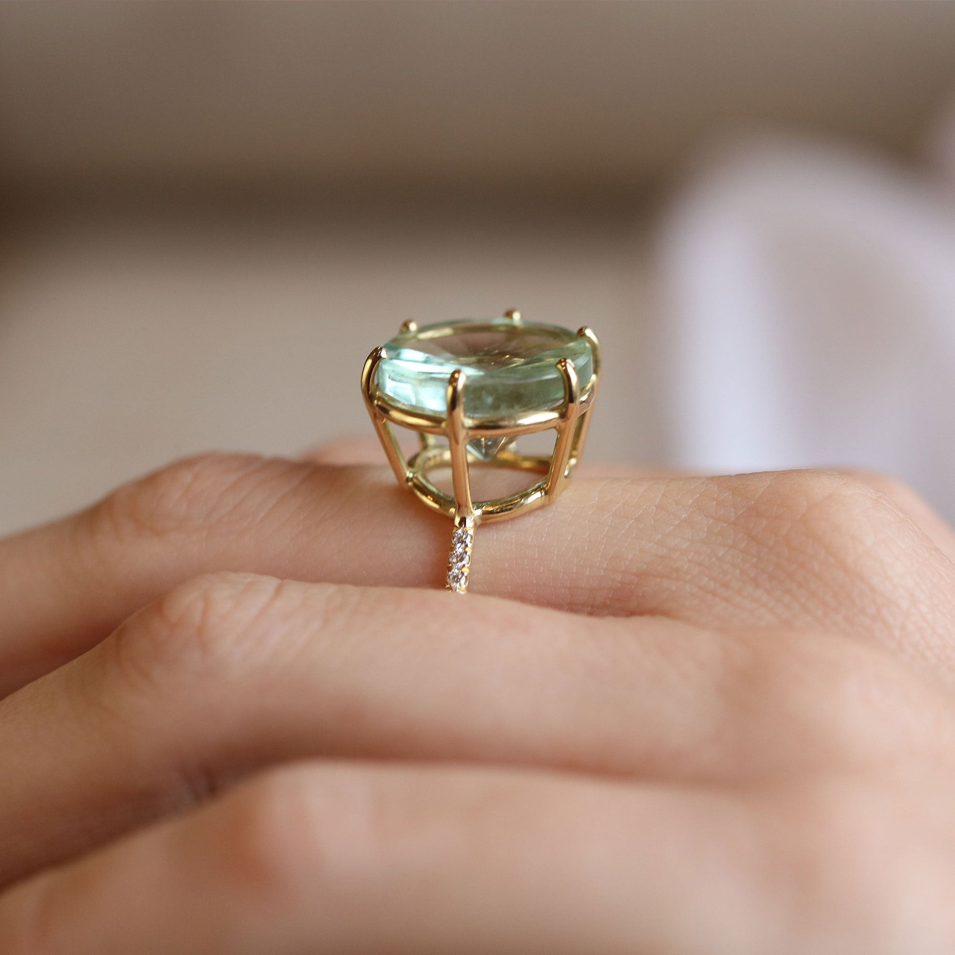 18k gold georgian style bezel aquamarine ring with diamond band detail.
