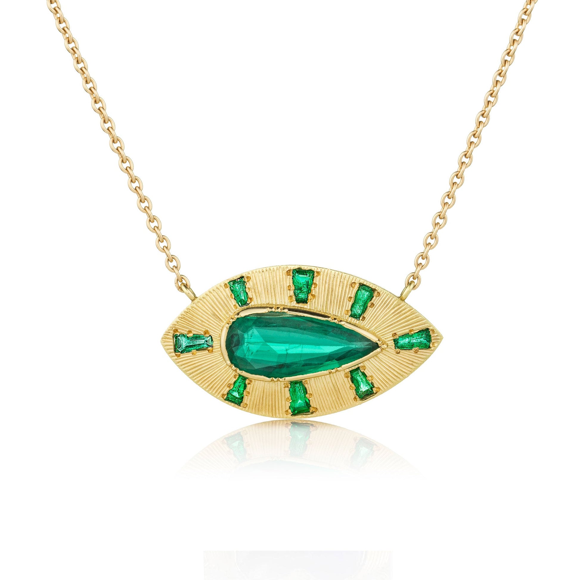 From Brooke's Talisman Collection one of a kind hand engraved Emerald eye necklace with tapered Emerald baguette highlights.