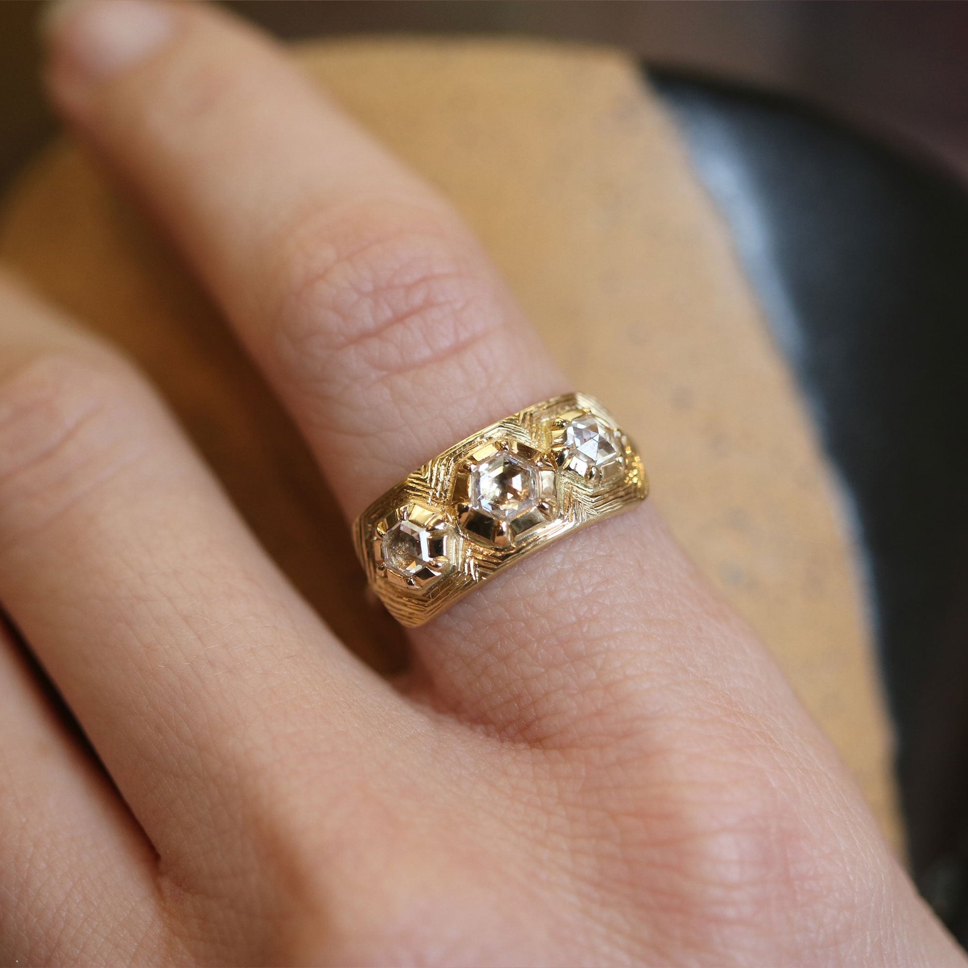 From Brooke's Utopia Collection, one of a kind white Diamond ring with 18k gold textural hand engraving.